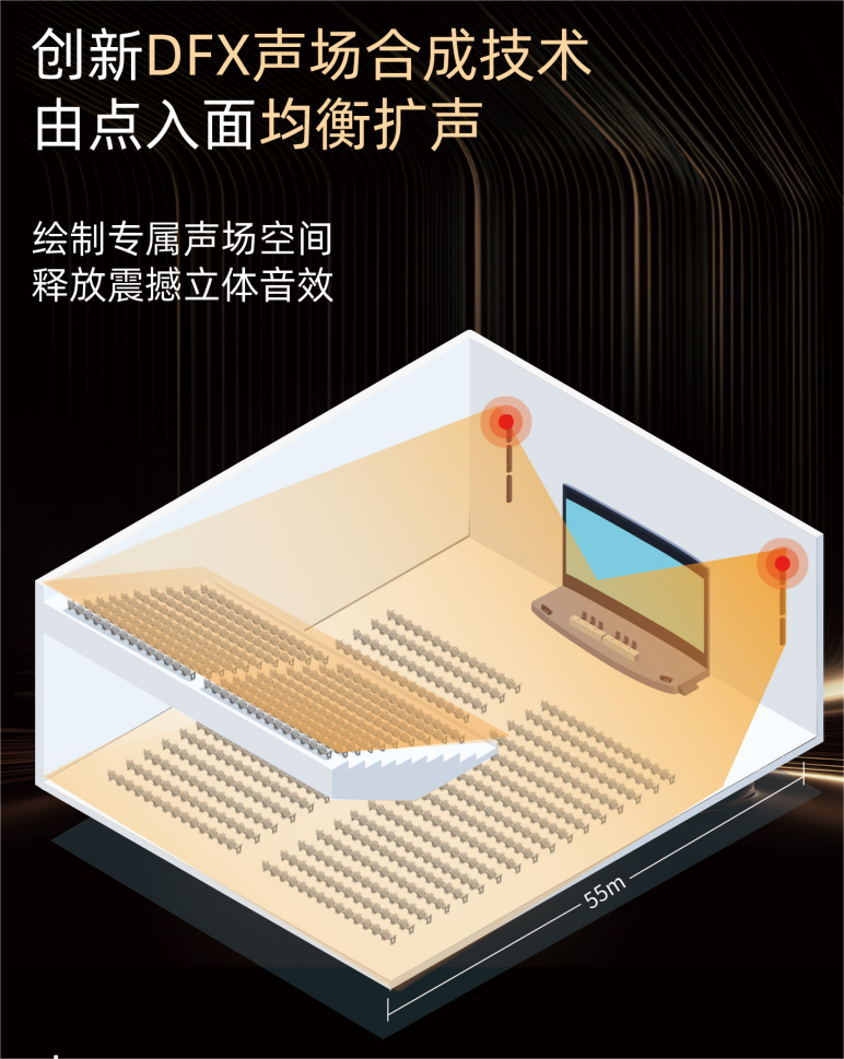 針對上述方案的痛點,世邦(SPON)推出的可調(diào)指向線性陣列音柱為中大型會議空間提供了更優(yōu)的解題思路。與傳統(tǒng)方案相比,其核心優(yōu)勢在于引入了先進的DFX聲場合成技術(shù)。